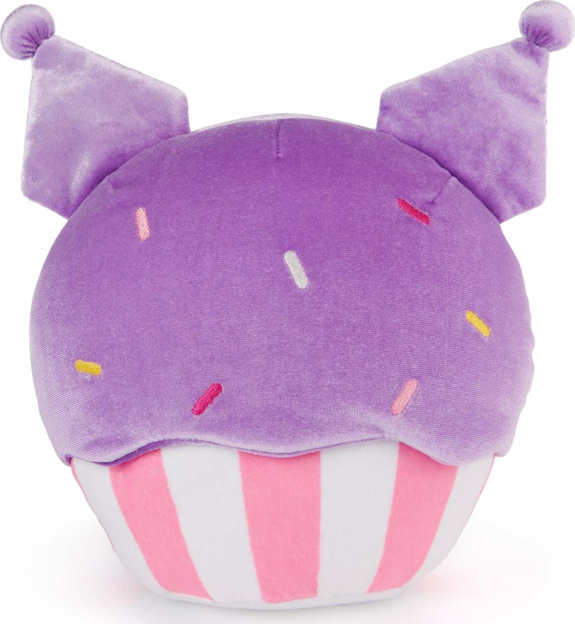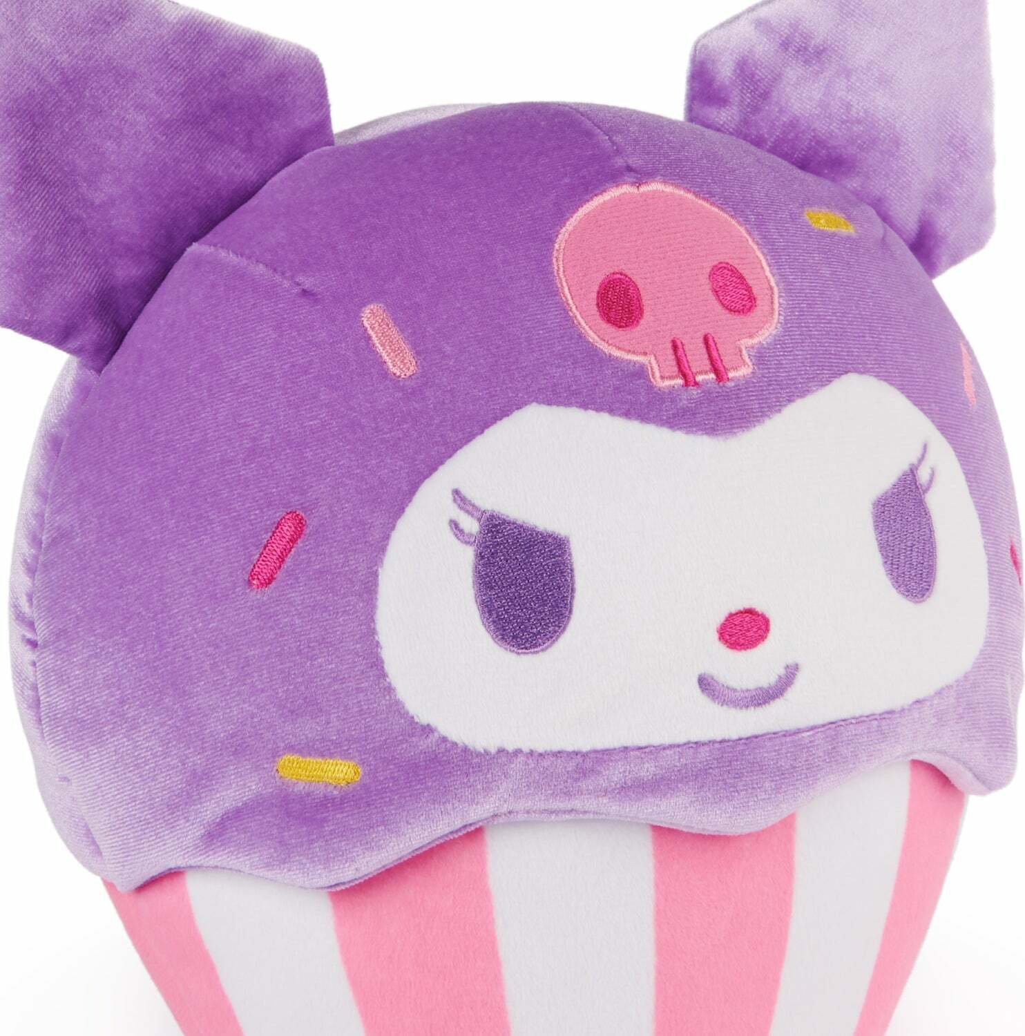 This large, huggable 8-inch cupcake plush features Kuromi nestled in a pink-and-white striped baking cup, wearing her iconic purple jester's hat with a pink embroidered skull. Kuromi's purple and pink embroidered facial details also match the fun pink, white, and yellow embroidered sprinkles that dot her hood. Its bright, colorful design makes this soft plush an eye-catching piece for any kawaii plushie collector. Make playtime even sweeter by completing your cupcake collection with 8-inch Hello Kitty and My Melody styles!