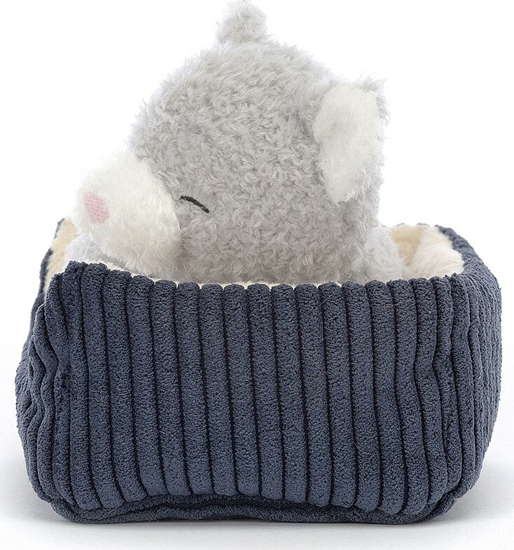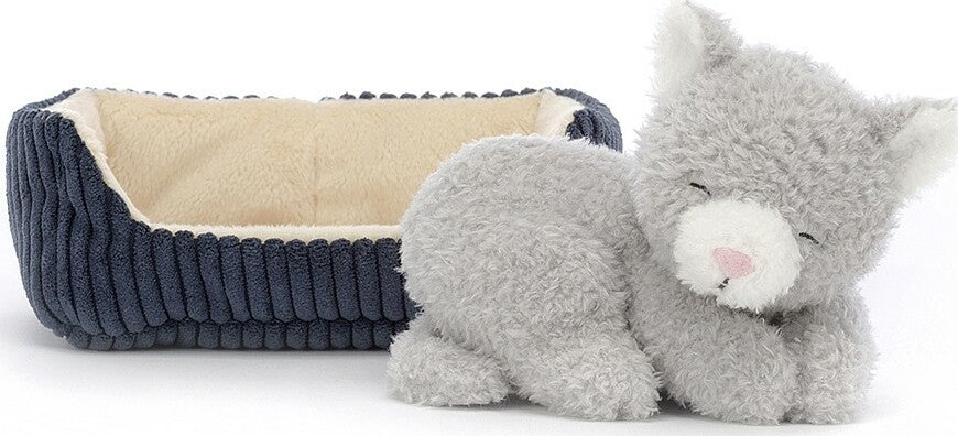 If you lift Napping Nipper Cat up, be very careful not to wake them! This gentle kitten has cloudy-soft fur in soothing pebble grey, with a cream-splash snoot and matching perky ears. All curled up in a cordy blue bed with beautiful buttercream lining, someone's dreaming of scruffles and salmon.