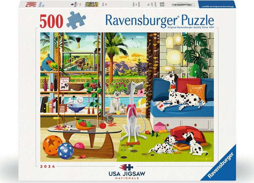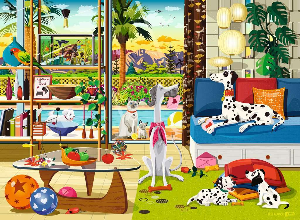 Enjoy the dry desert heat or stay cool indoors with Ravensburger's "Pets of Palm Springs" puzzle! While the Dalmatian and his lady are exchanging love notes, the puppies are playing inside and out. Fun elements include the parrot perched on the shelf, the kitty cat looking for some playmates, and an aquarium complete with a sunken ship, deep-sea diver and a treasure chest. This endearing scene was completed in the Pairs Preliminary Round 2 at the 2024 USA Jigsaw Nationals speed-puzzling competition — woof!