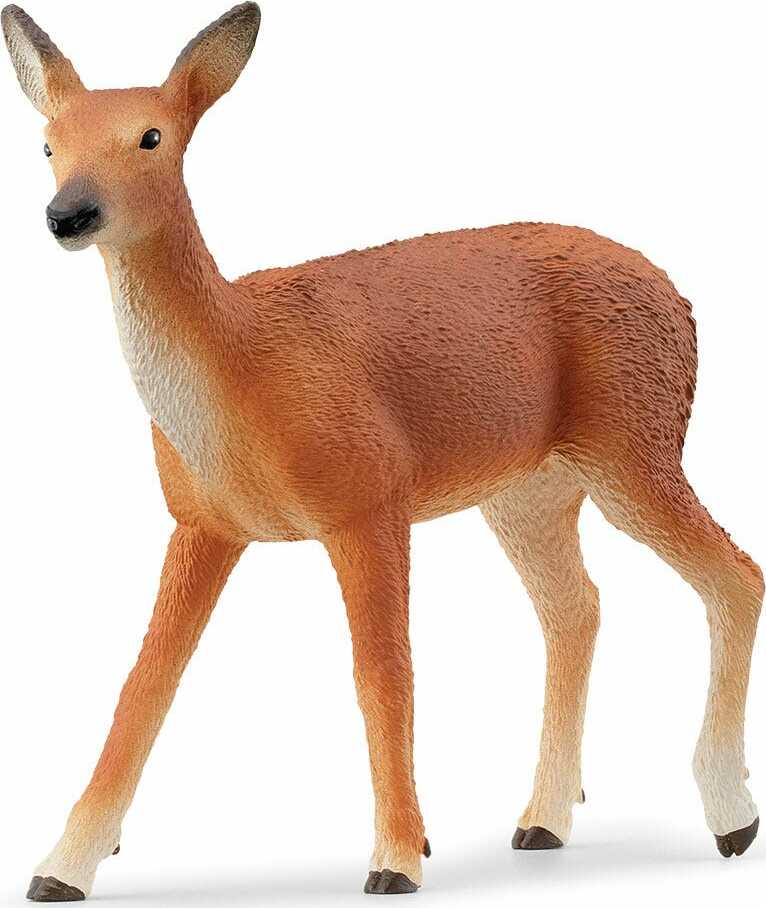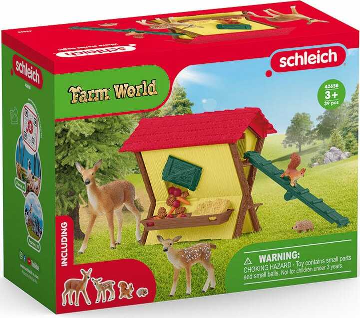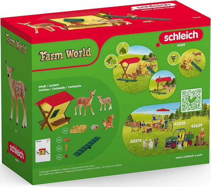 The animals in the forest are happy as can be, because they can always find something to eat in the feeding trough. There's something for everyone: the Red Deer Doe and her calf are happy about the food pellets, but they both also enjoy crunchy carrots. The shy hedgehog also likes to come by. The squirrel slips curiously through the feed hatch into the manger. Maybe it will find a nut? In any case, it has found a cozy hiding place under the roof. Up there, it can also see the forest farmer coming along in his car (playset sold separately).