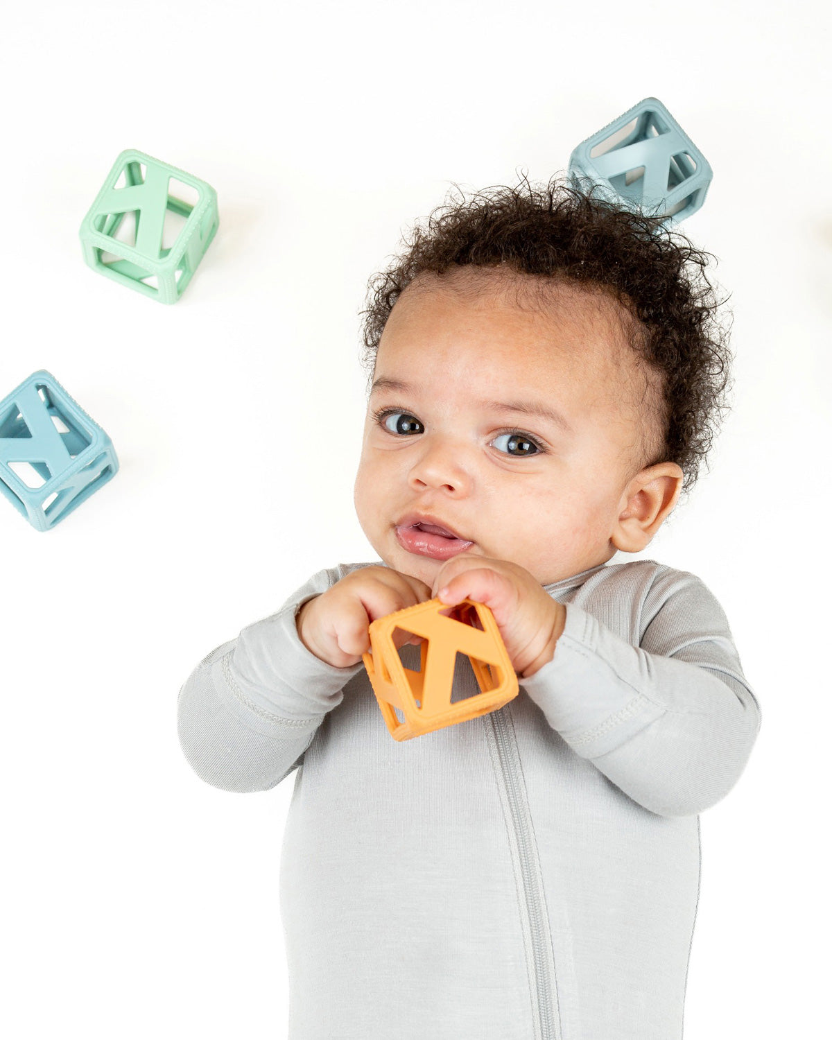 Designed with love by a mom, this Stack N Chew Mini Cubes and Chew Cube bundle is the perfect present for babies and makes teething time easier for new parents! A chic rattle and teether combo, the Chew Cube has soft, textured edges that soothe gums. Large flexible holes promote early gripping skills while baby is entertained with a gentle rattle! The four Stack N Chew Mini Cubes are also made of textured food-grade silicone, making them safe to teethe on and easy to stack. The contrasting colors stimulate hand-eye coordination and promote early fine motor skills.