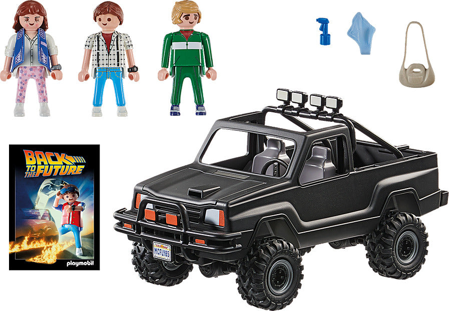 Great Scott! Marty McFly's crazy time travel continues. Marty has just arrived back in 1985 when the next time jump - to the year 2015 - is on the horizon. Based on the second film from the cult-classic trilogy, Doc and Marty must prevent Marty's son from sabotaging the McFly family's future. In 1985, Marty takes a seat in his brand new pick-up truck with his girlfriend Jennifer Parker and drives through the streets of Hill Valley. But in the future, Marty's arch-nemesis, Biff Tannen, is in on the action and leaves no stone unturned to get one over on Marty. The new playset once again brings PLAYMOBIL fans Back to the Future. The set includes Marty McFly, Jennifer Parker and Biff Tannen, as well as a Pick-up Truck with space for two figures and a collector's postcard for fans. The hood and tailgate of the Pick-up Truck can be opened.