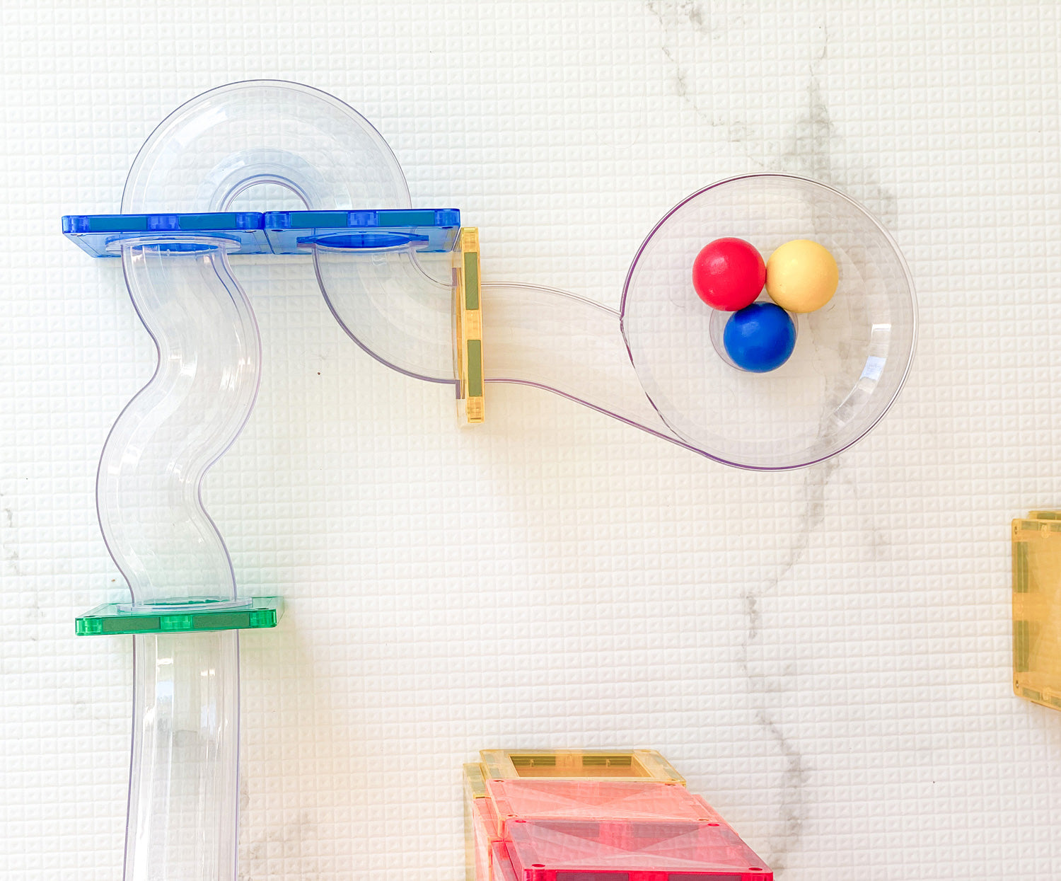 Enjoy endless opportunities for STEAM learning and open-ended play with this gorgeous magnetic ball run. Curious kiddos explore gravity, motion, force, and more as they build fascinating designs based on the 43-page idea booklet or their own imaginations! The 92 colorful pieces include clear fluted tubes, wooden balls, and rainbow connector tiles to create a range of exciting twists, turns, slopes and soundscapes. Please note, this pack does not include any standard CONNETIX tiles.