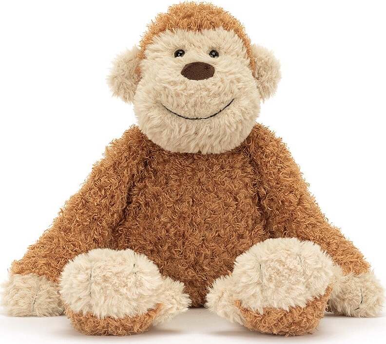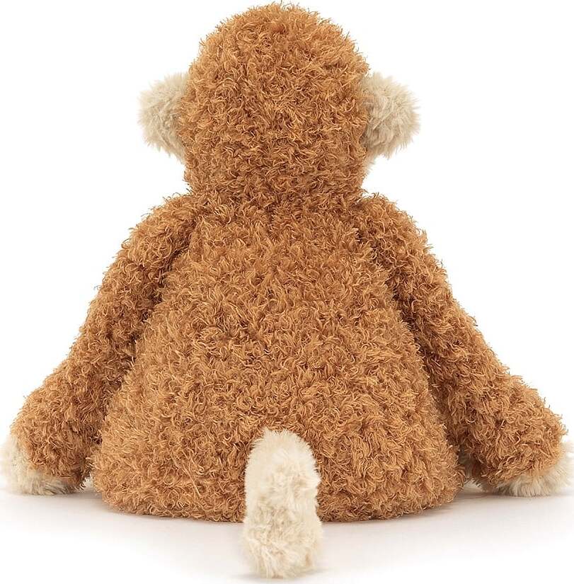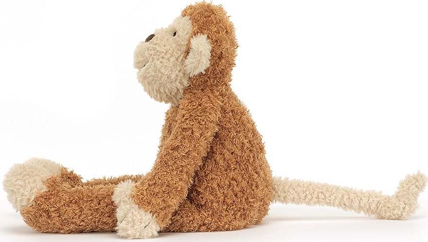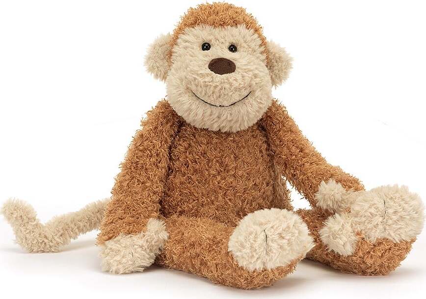 Junglie Monkey is soft in curly ginger fur. With a beige face, paws and curly tail, this monkey has a big suedette nose and a big, stitched smile