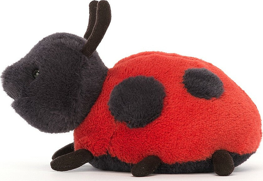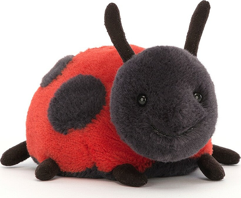 Layla Ladybird loves to explore, and is always crawling and flitting about! With bright scarlet fur, bold black dots, suedey feelers and lots of kicky legs, this round little rascal is so very huggable. With a cheeky grin and lots to see, Layla wants to go ambling with you!