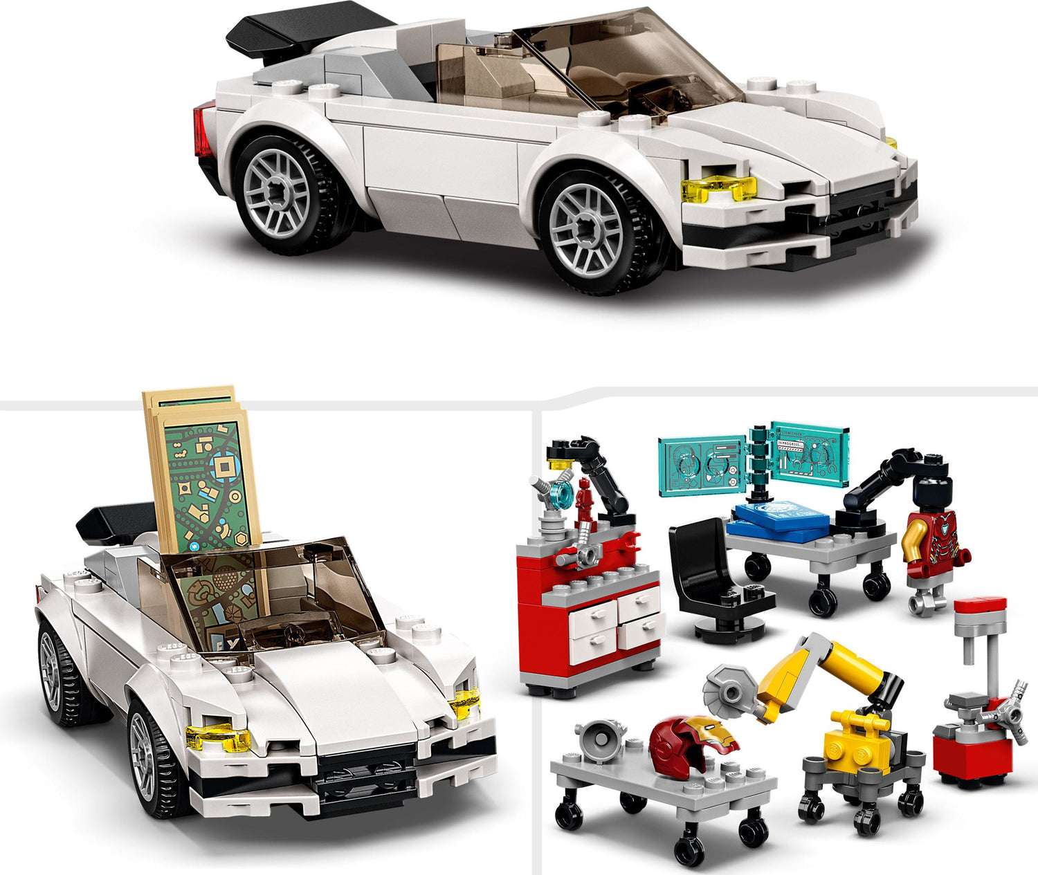 - Features a toy sports car with Stark Expo model-map, robot assistant arm, workshop area with tools, 3 holographic displays, and changing platform