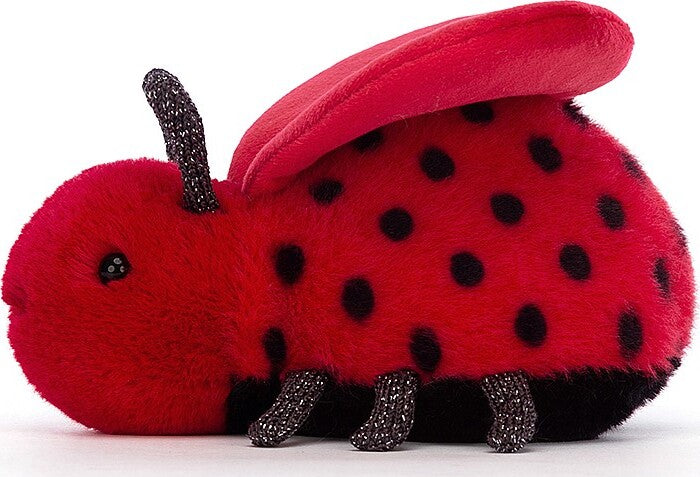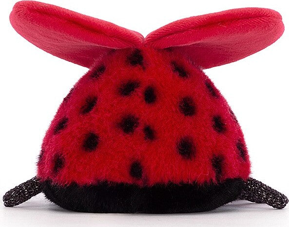 Loulou Love Bug is a spotted pocket cuddle! Bright and bold and red and black polka dot fur, this sweet bug has glittery antennae, a big stitched smile, and heart shaped wings.