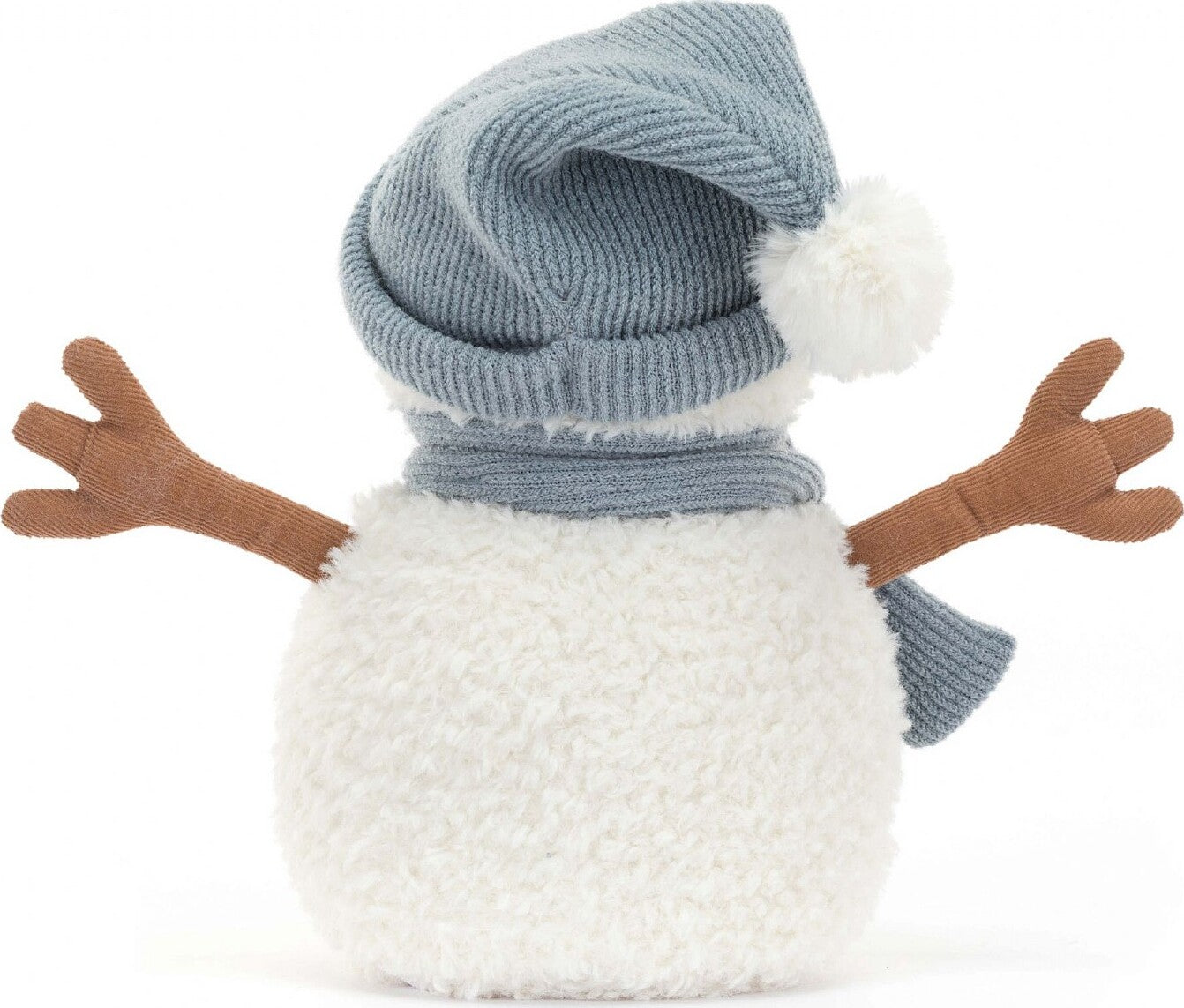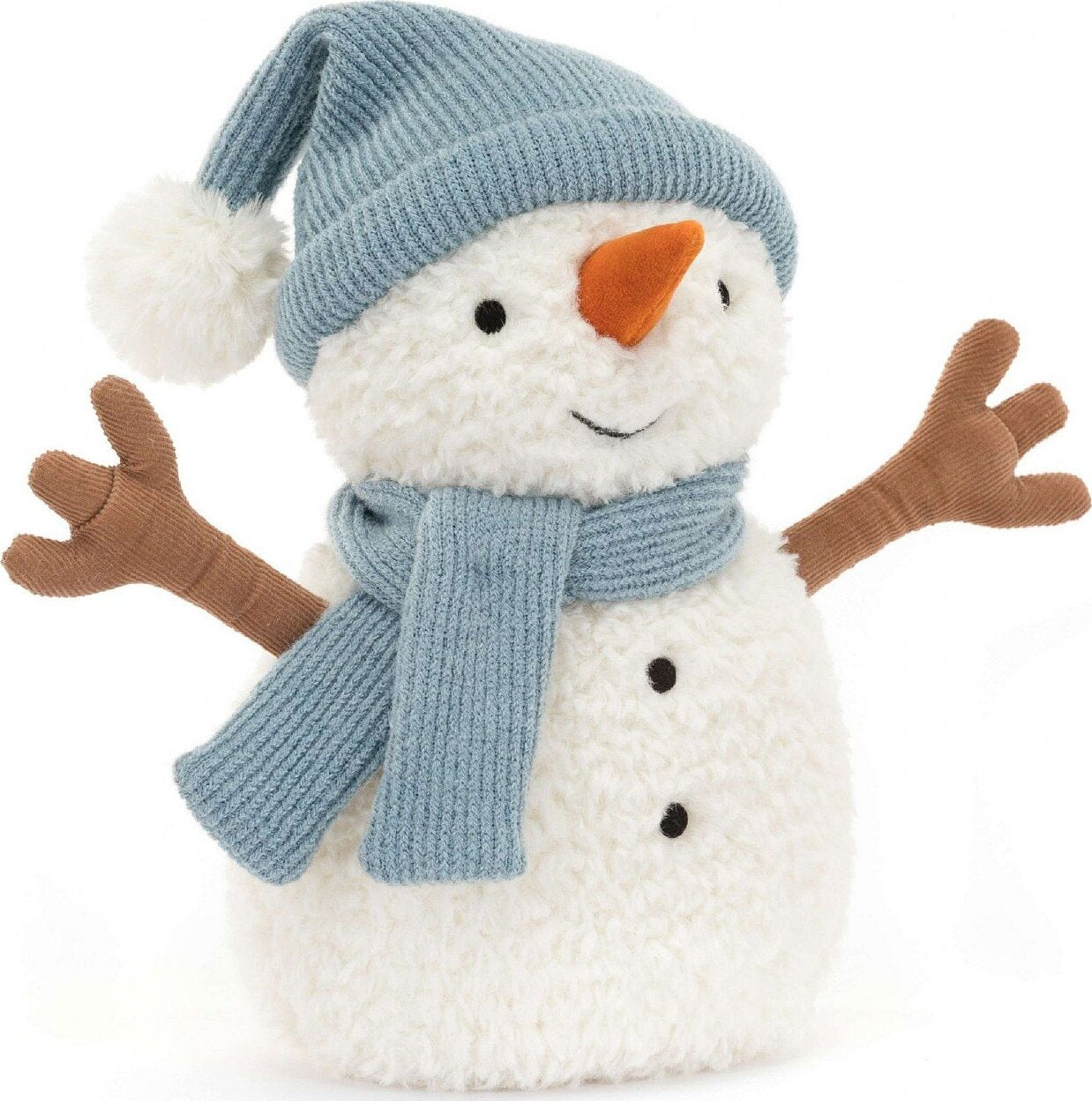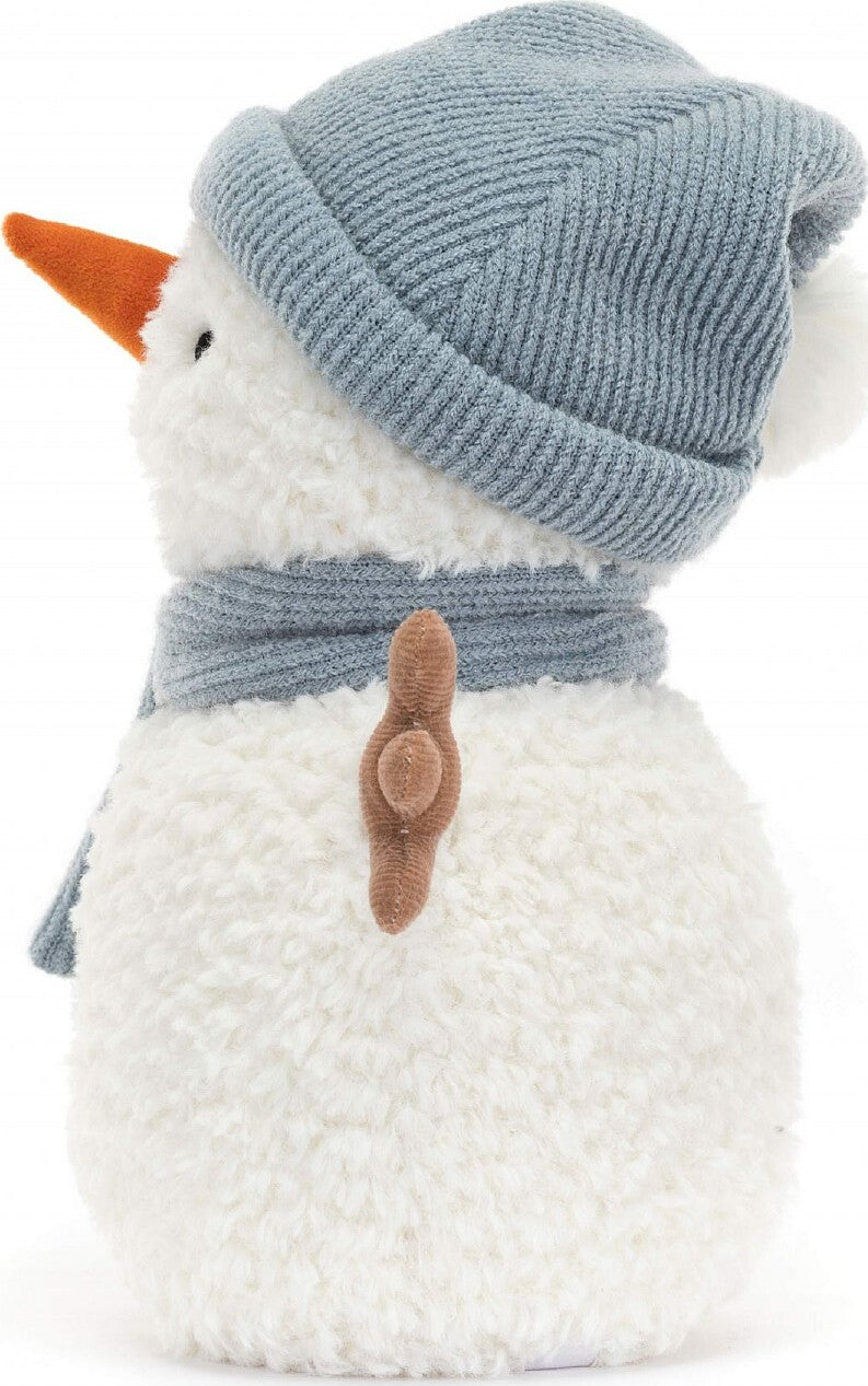 Sammie Snowman is a scrumptious scoop of vanilla ice-cream! This fleecy snowman has cord cocoa arms, stitched coal buttons and a suedette carrot nose, with a light blue knitted hat and scarf. With a sturdy bean base, Sammie's poised for any snowball fight!