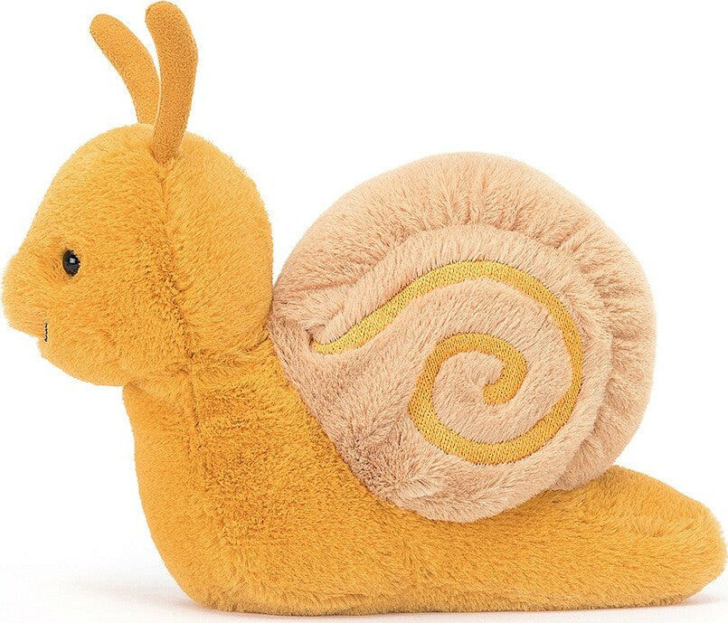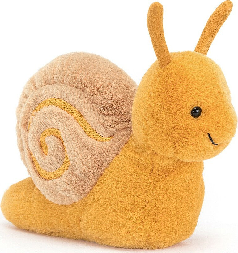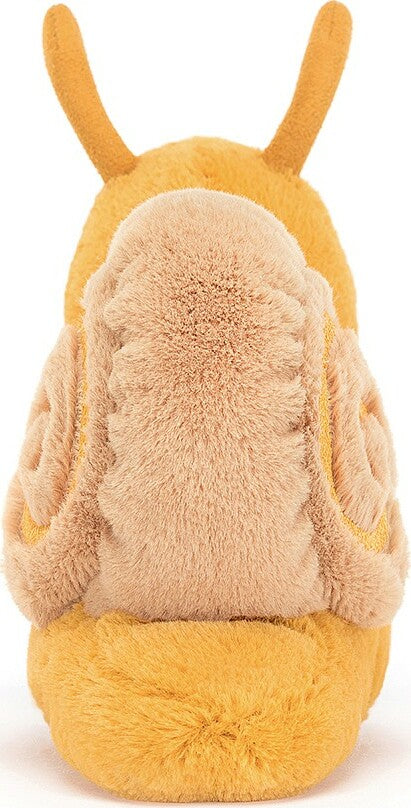 Sandy Snail is one laid-back bug, with a curious grin and bright saffron fur. Looking sunny-swell with a swirly brown shell, this dreamy softy takes time to smell the roses. And the daisies. And the buttercups. With suedey antennae to help find the way, this snail will happily glide all day.