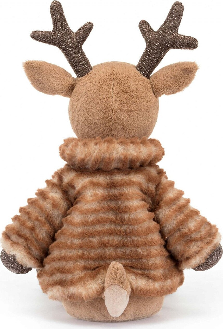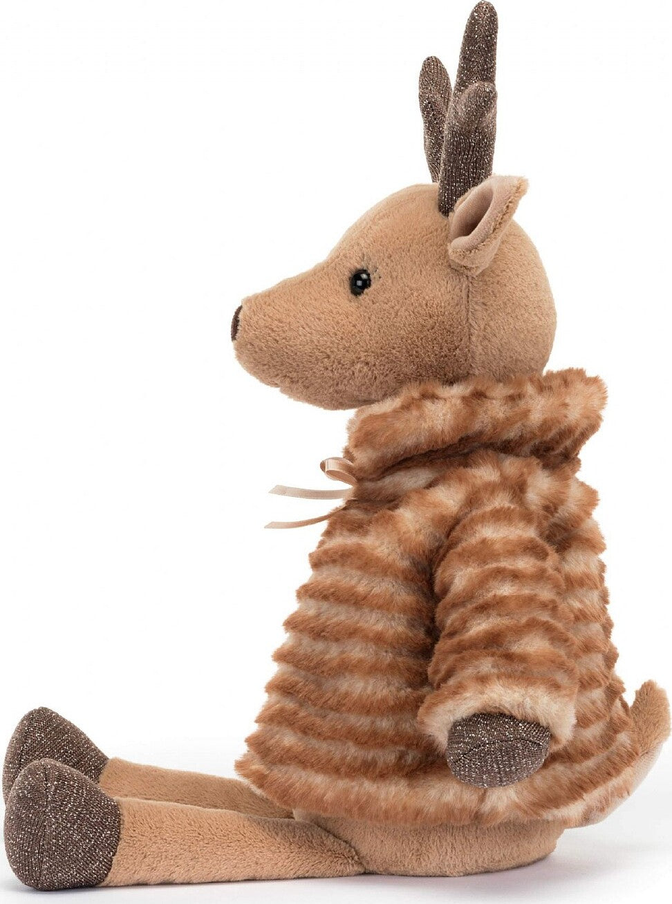 Announcing the divine Sofia Reindeer! This glam deer is the epitome of Christmas chic. Sofia wears a fluffy coat in creme-caramel stripes, with a ribbon tie and champagne lining. It goes perfectly with her dark-chocolate nose, embroidered lashes and glittering hooves and antlers.