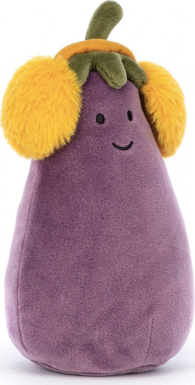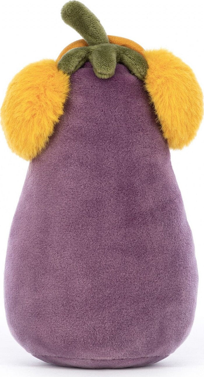 Toastie Vivacious Aubergine loves a bold colour contrast! This stretchy purple veggie wears mango yellow earmuffs over their soft green stalk and leaves. With a smiling expression and weighted base, this aubergine shares comfort and joy!