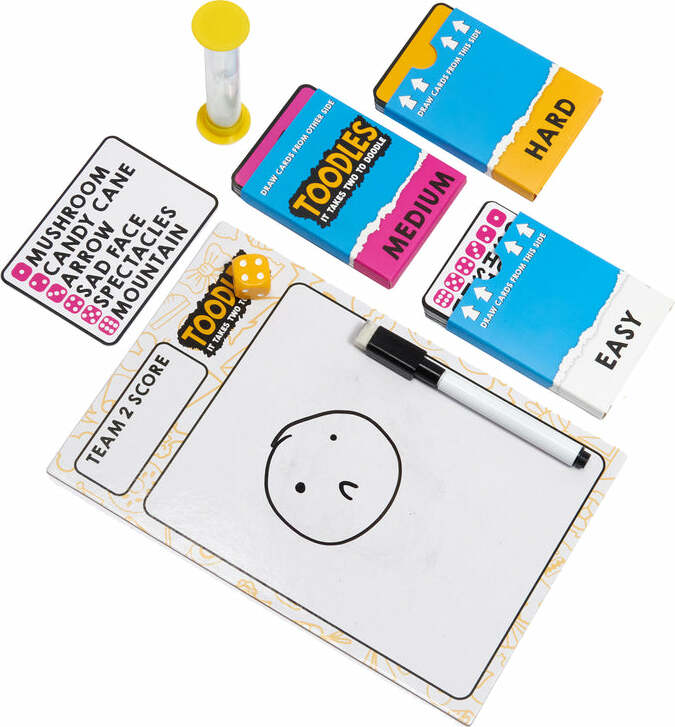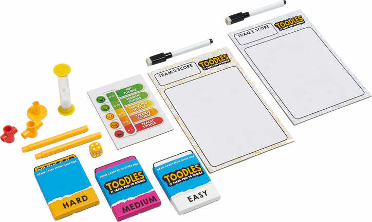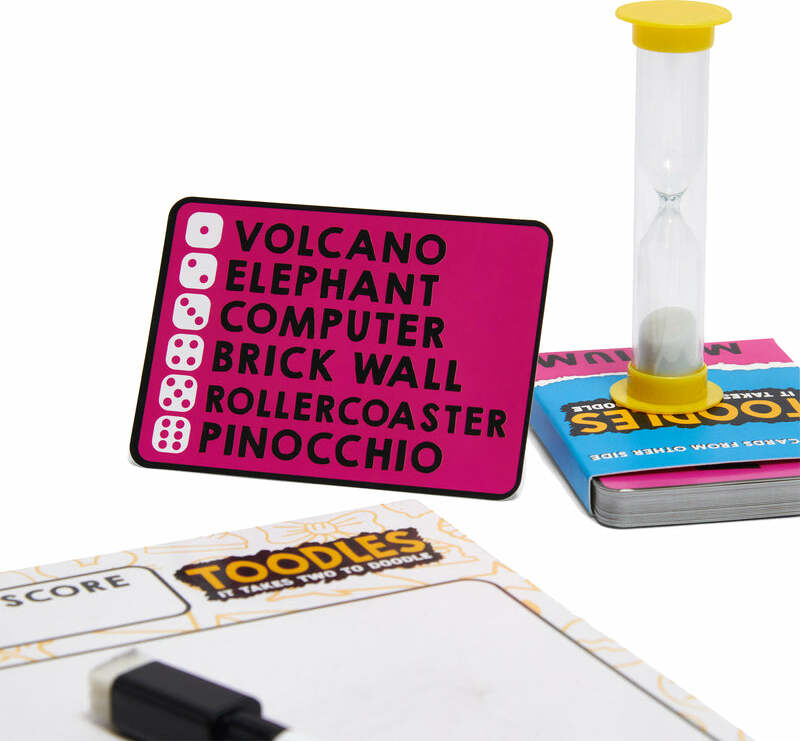 In Toodles, two players have to collaborate on a drawing, at the same time. By inserting their Toodle wands into the the Toodle Pen Holder they have control of the pen. And have just 30 seconds to draw one of the items selected by a dice roll, on a card.