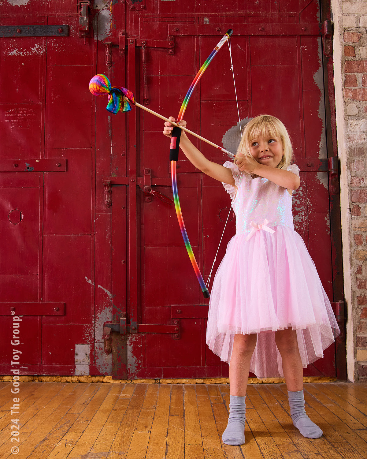 Kid invention alert! Two Bros Bows was invented by two 10- and 7- year old brothers who wanted to create a durable, safe, mom-approved archery set after being inspired by the movie "Brave". Now a well-known company, Two Bros Bows products are still USA-made, have won awards, and are designed with CPSIA safety tested fabric covered foam tips for safe play alone and around others. This set includes a trifold target, rainbow bow, and two soft-tip arrows (red and tie-dye).